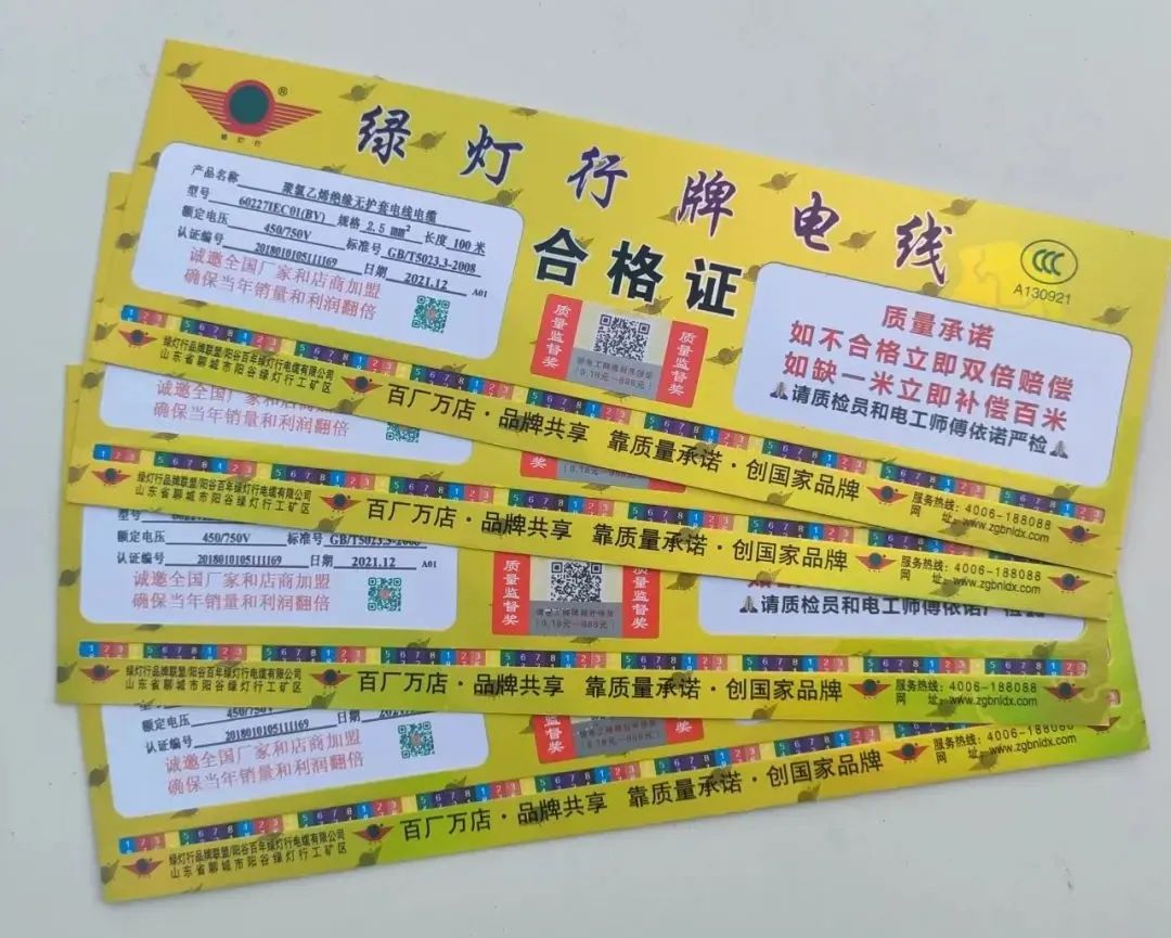 綠燈行電線產(chǎn)品合格證的編碼暗紋防偽標(biāo)識,同時具有防偽紅包碼用以掃描查詢辨別真假。