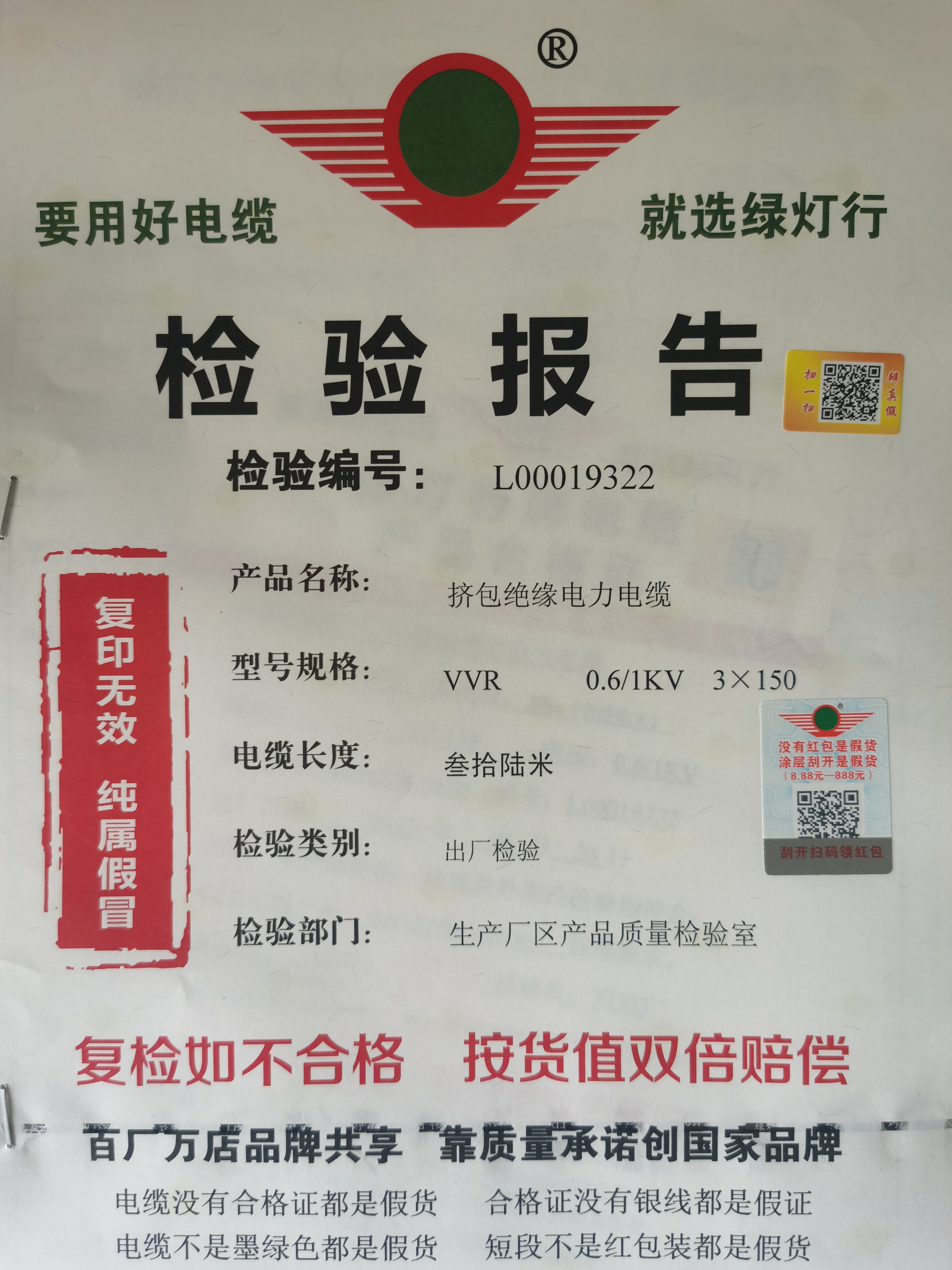 綠燈行電線電纜產(chǎn)品檢驗(yàn)報(bào)告封面的防偽紅包碼和防偽二維碼,銀線暗紋。